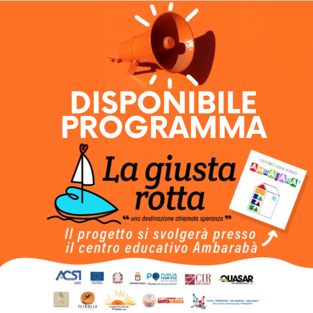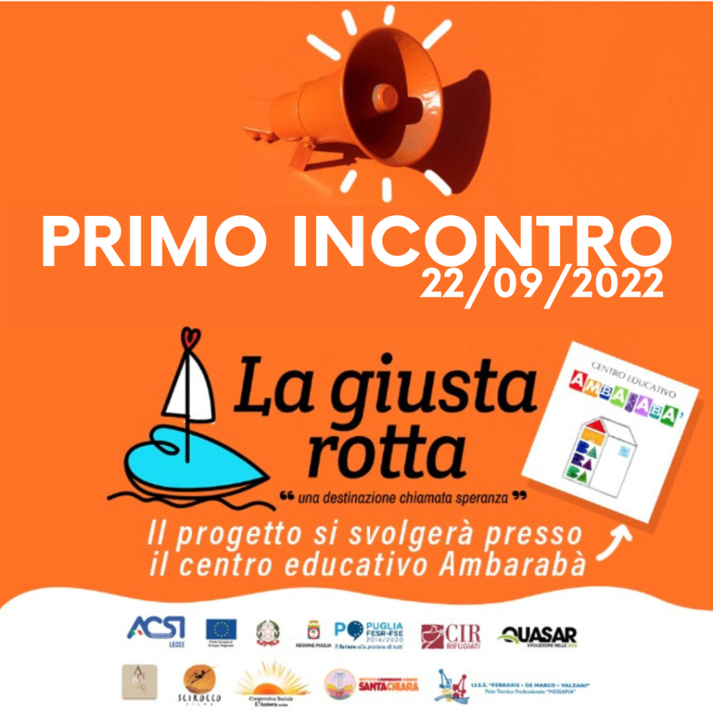Il 22 Settembre si è tenuto presso il centro AMBARABÀ il primo incontro del progetto LA GIUSTA ROTTA, dove si è parlato ai ragazzi di ciò che il progetto rappresenta, di quali sono gli obiettivi che si vogliono raggiungere e soprattutto il programma degli incontri futuri.